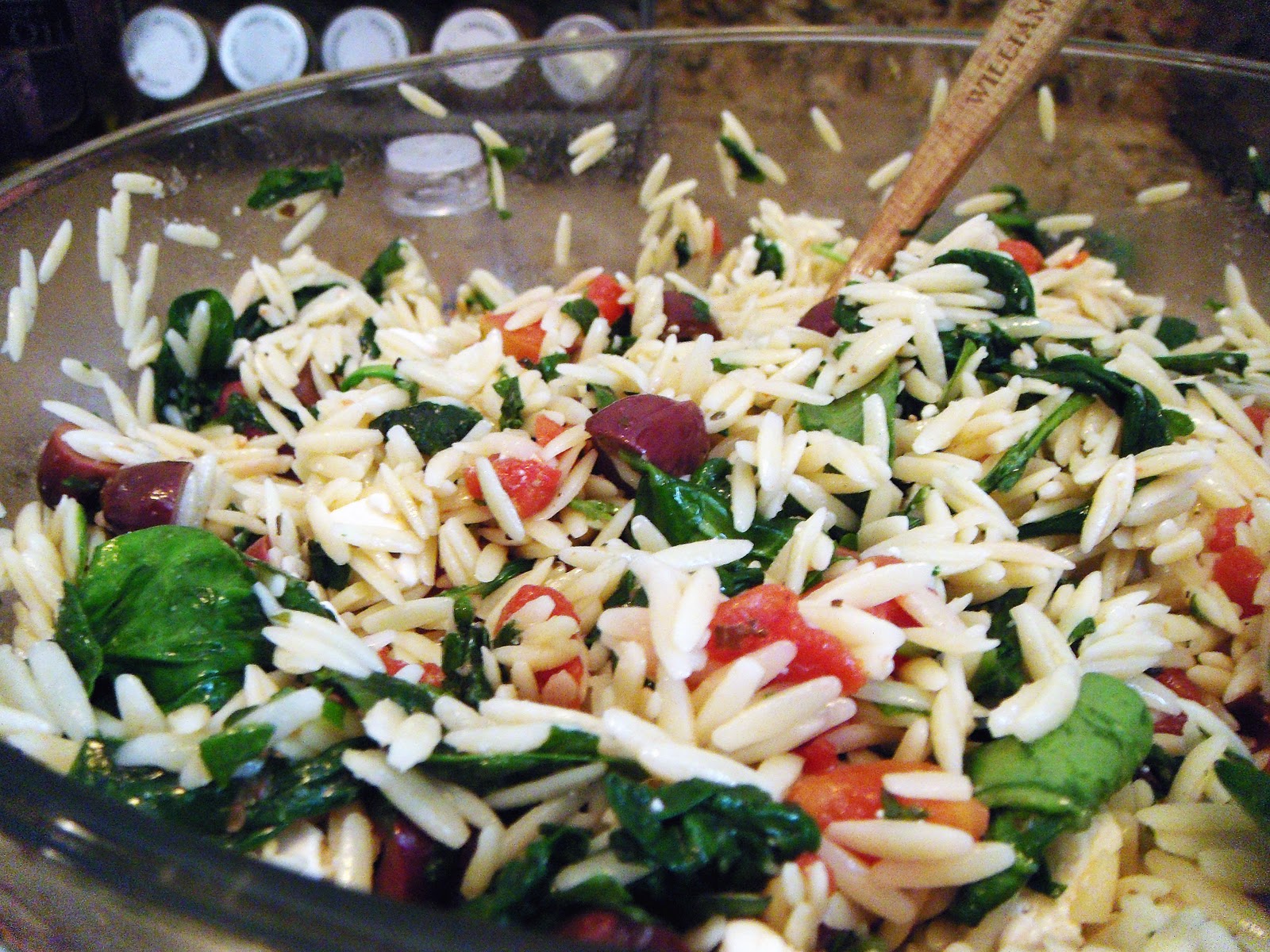 once orzo and spinach are completely cooled, add olives, tomatoes and feta